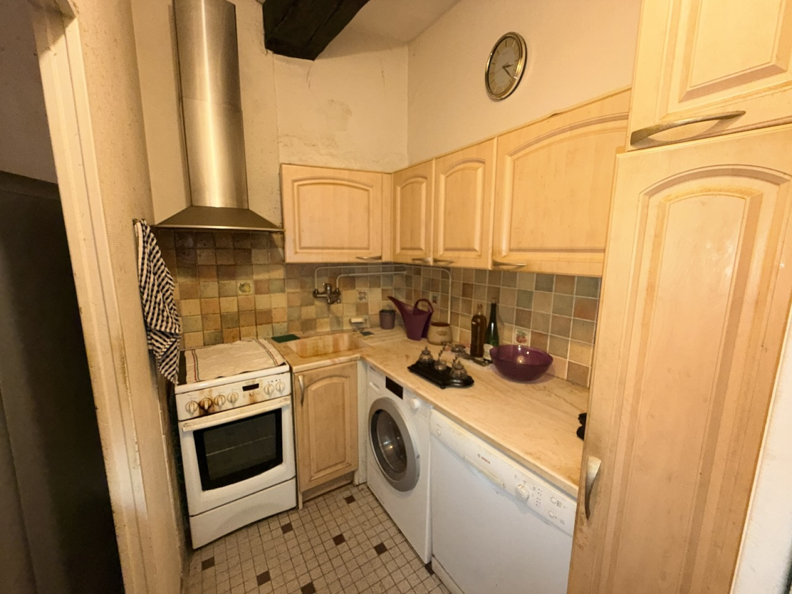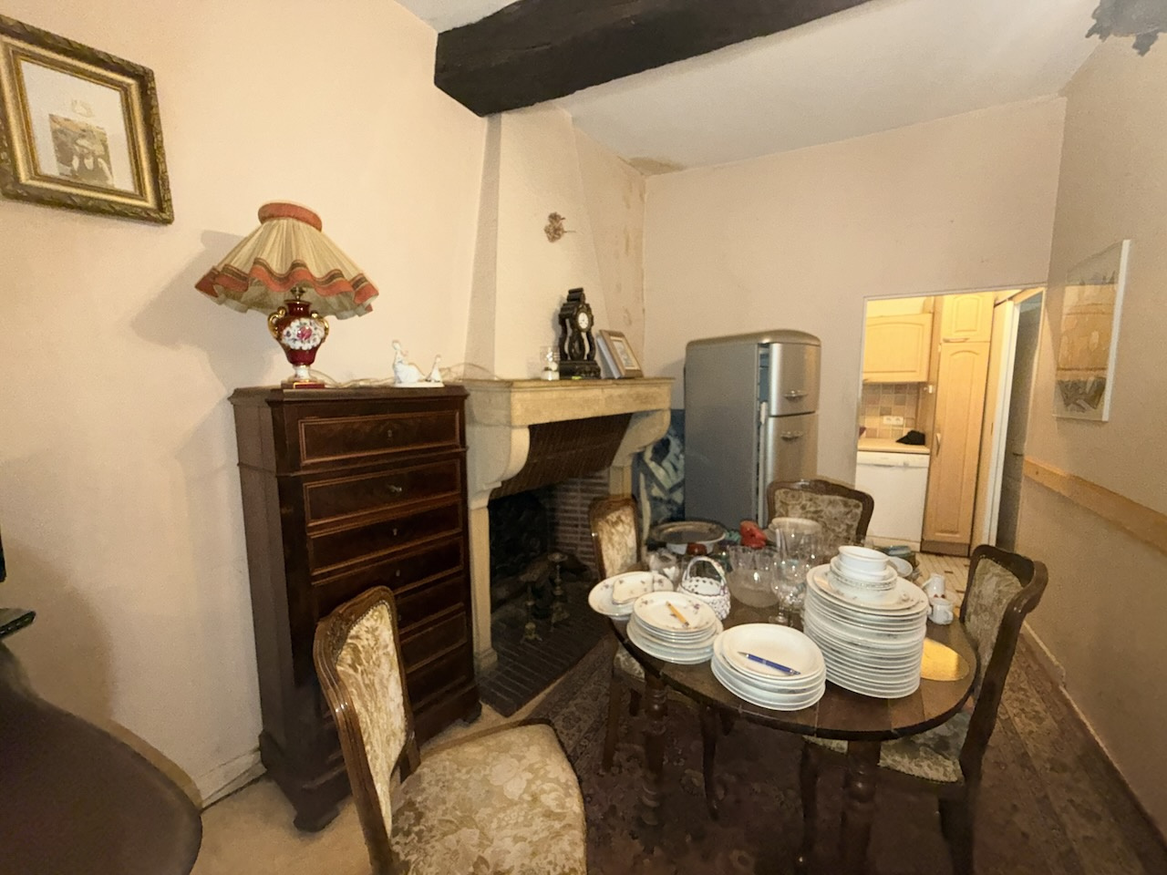 Dégagement, cuisine aménagée, séjour, parquet, chemminée pierre, une pièce.