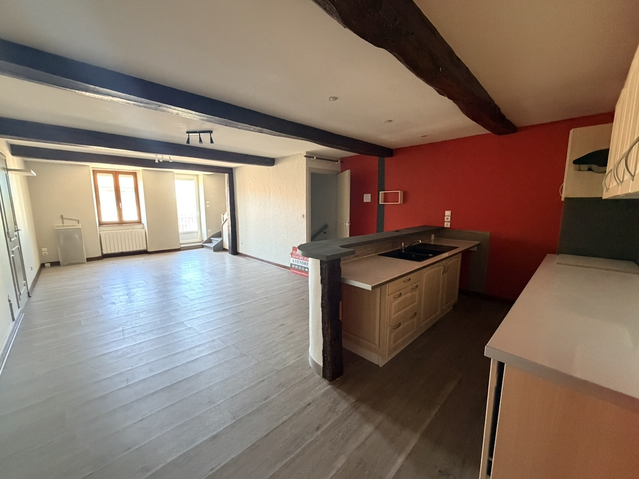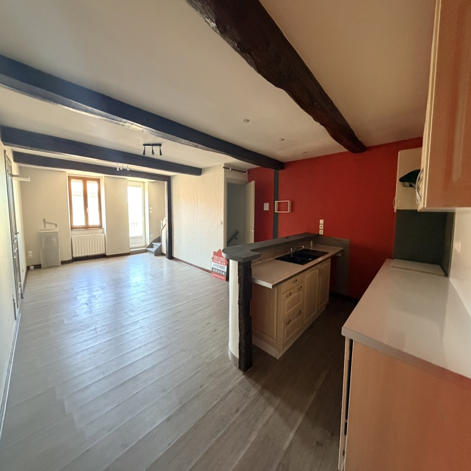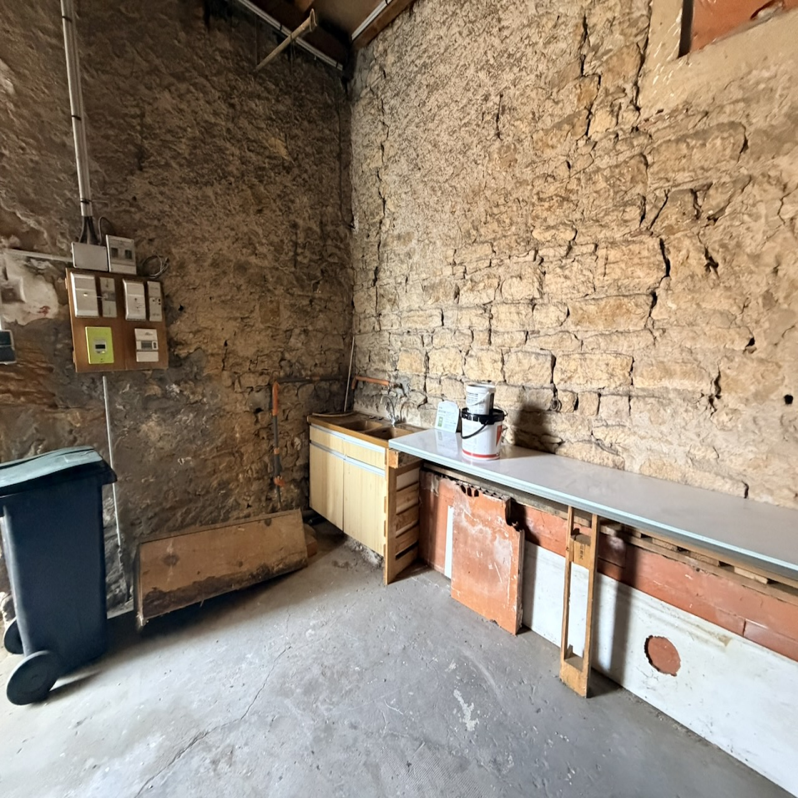 Séjour, cuisine aménagée, ouverte, 45 m2. WC. Buanderie, placards, 17 m2. Salle de bains.