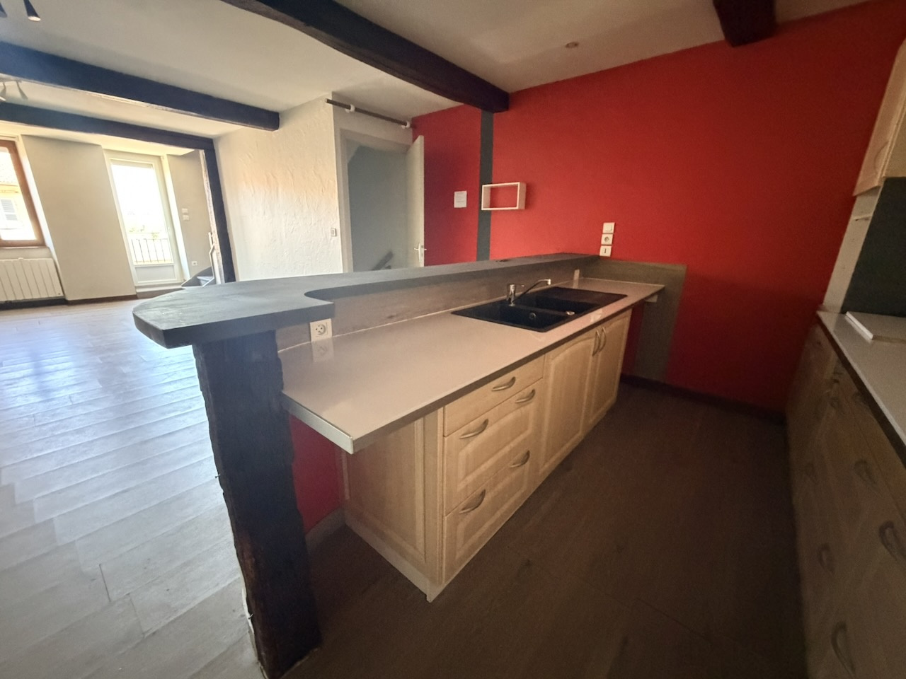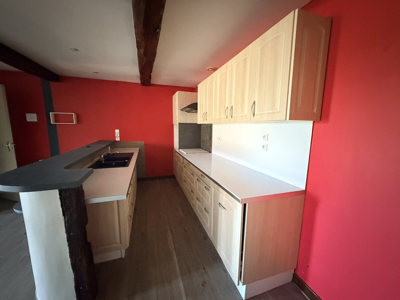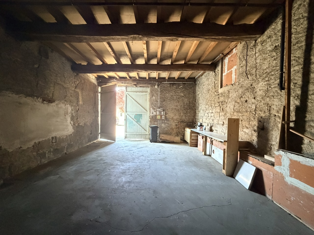 Séjour, cuisine aménagée, ouverte, 45 m2. WC. Buanderie, placards, 17 m2. Salle de bains.